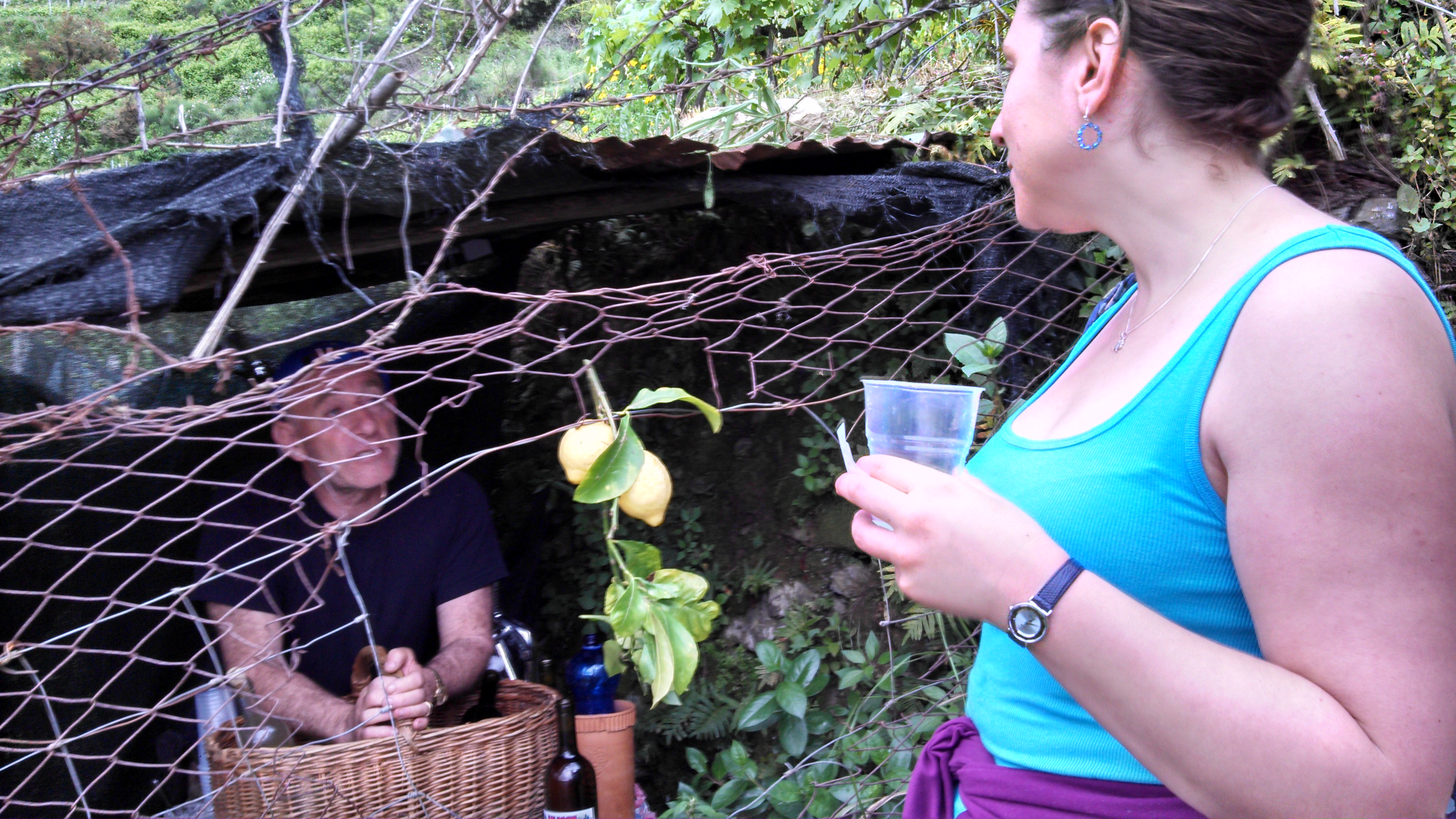 - At the conclusion of our awe-inspiring hike, which was also an amazing workout, we saw a line. People were queuing up for a limoncello and lemonade stand on a man’s farm, served fresh from the lemon trees. Anna and I enjoyed lemonade while Jen had limoncello. I had a sip and regret not buying any. I’ll have to go back. Luckily it’s so close that I can return. We made friends with the old man selling the lemonade, and he invited me to go on his boat one day when he’s in Genoa. I have his business card.