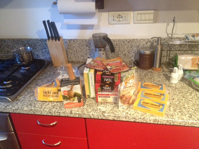 After a quick tour of the school, we met in the staff room for pizza, focaccia, salami, and of course prosecco. We had the opportunity to chat with the staff of the German School, all intimidating in their matching uniforms, then headed to the apartment to freshen up for dinner. The girls surprised me with many gifts. Anna brought a selection of tastes from home, including cheddar cheese! and ingredients for Thai and Tacos. Among other goodies I requested from home, Jen surprised me with a mortar and pestle so I wouldn’t have to make my guacamole with a bowl and shot glass.